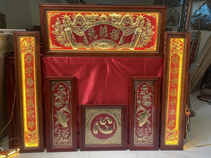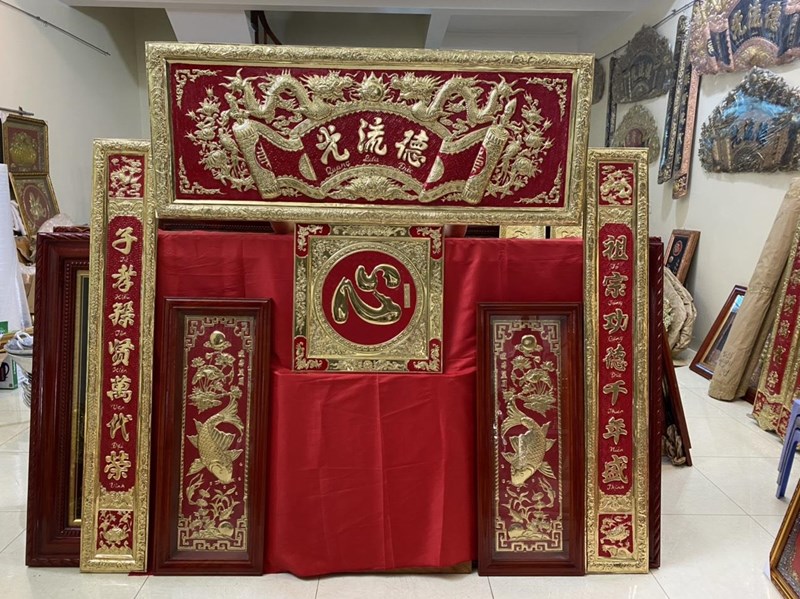 Cả câu đối và đại tự đều được phủ bóng để tăng độ bền và giá trị của sản phẩm. Bộ đại tự- câu đối được làm hoàn toàn thủ công bằng đồng vàng nguyên tấm cao cấp dày 4 dem. Bằng sự tài hoa của người thợ làng nghề gò đồng Đại Bái, đường nét hoa văn rồng, phượng đã được tái hiện sống động, tinh xảo trên nền chất liệu. Phù hợp với các không gian thờ: ban 1m76,1m97