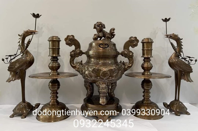 Bộ đỉnh ngũ sự được làm bằng đồng đỏ đúc nguyên khối với kích thước cao 70cm phù hợp cho ban thờ 1m97, 2m17. Bộ ngũ sự gồm 1 đỉnh đồng, 2 nến đồng, 2 hạc đồng. Ngoài ra có thể lựa chọn đồ thờ cúng đi kèm như lọ hoa, ống hương, mâm ngũ quả, ngai chén, đèn thờ cúng.